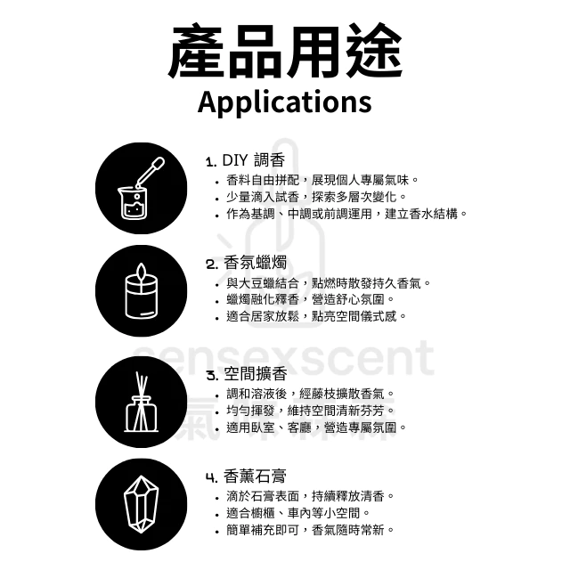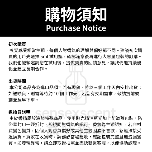 每款皆為未稀釋原香精,無添加、不稀釋,請勿直接塗抹,使用於身體產品前請適當稀釋並進行過敏測試。本公司原香精使用皆遵循IFRA規範,可另付費提供COA文件,香精產品僅供調香DIY與學習使用,若需量產販售,請委託合格工廠並遵守相關法規。